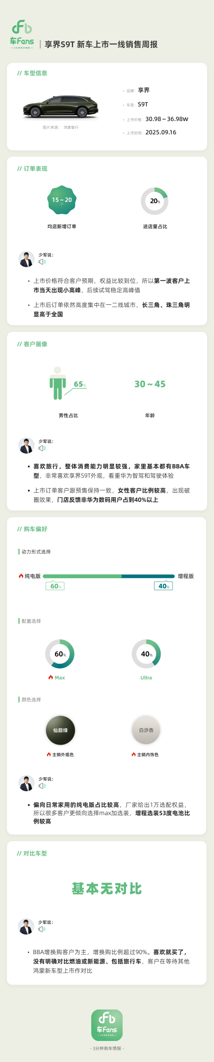 作为鸿蒙智行的首款旅行车,享界S9T上市之后的成绩确实给了我很大的震撼——上市一周后获得超13000辆大定量,这样的成绩在国内的旅行车市场中非常少见。根据行业调研报告,享界S9T首批用户的男女比例为6:4,而且以BBA增换购为主,消费者普遍认可享界S9T的产品力。