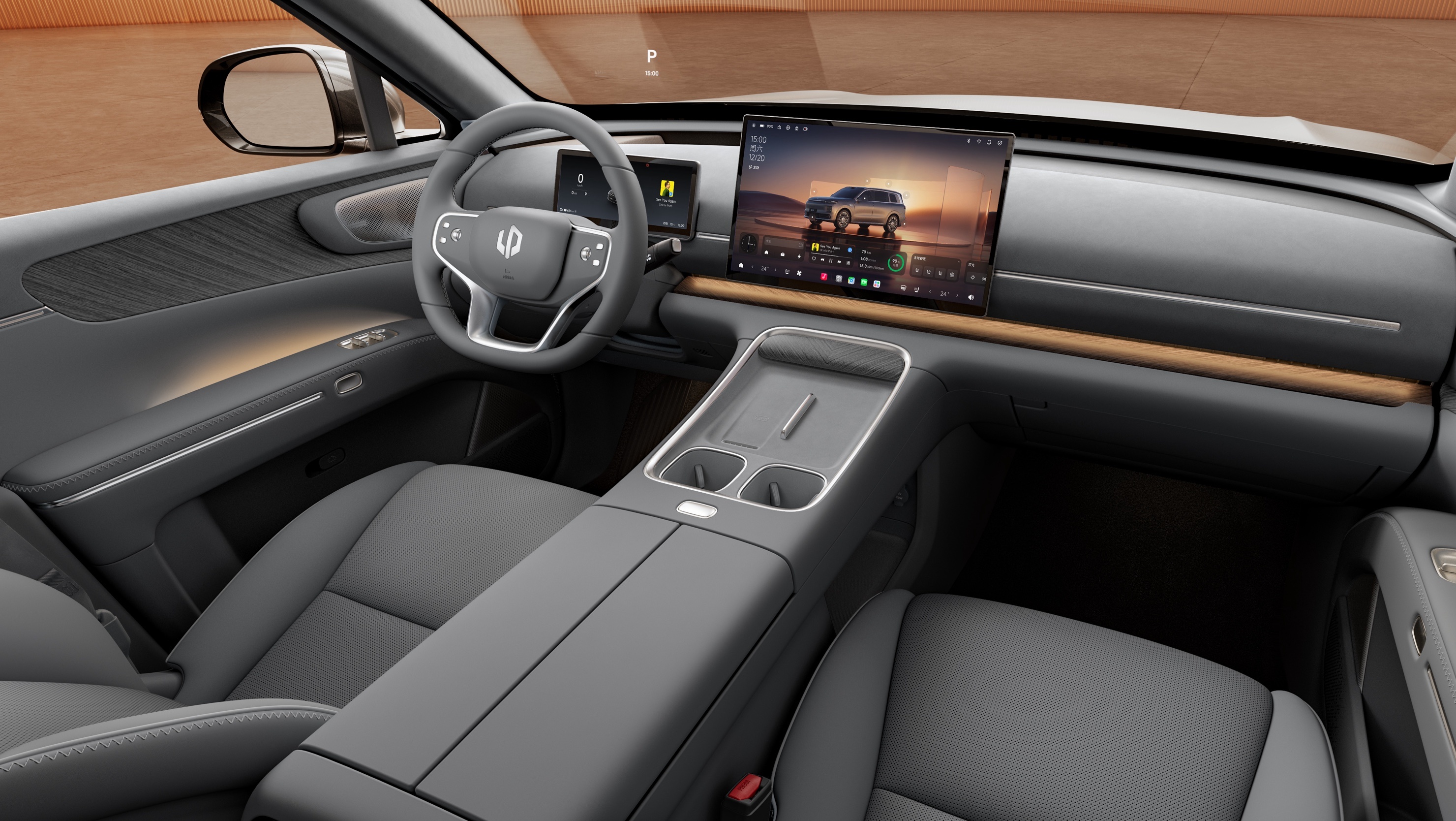 从官图看,D19座舱走的是更“现代旗舰”的设计语言:独立仪表屏+中控屏+大尺寸HUD抬头显示,主驾驶信息与交互分区更清晰;中央区域给到宽扶手、无线充电面板、下方镂空储物空间——这些细节很务实,明显奔着“家庭用车高频场景”去。