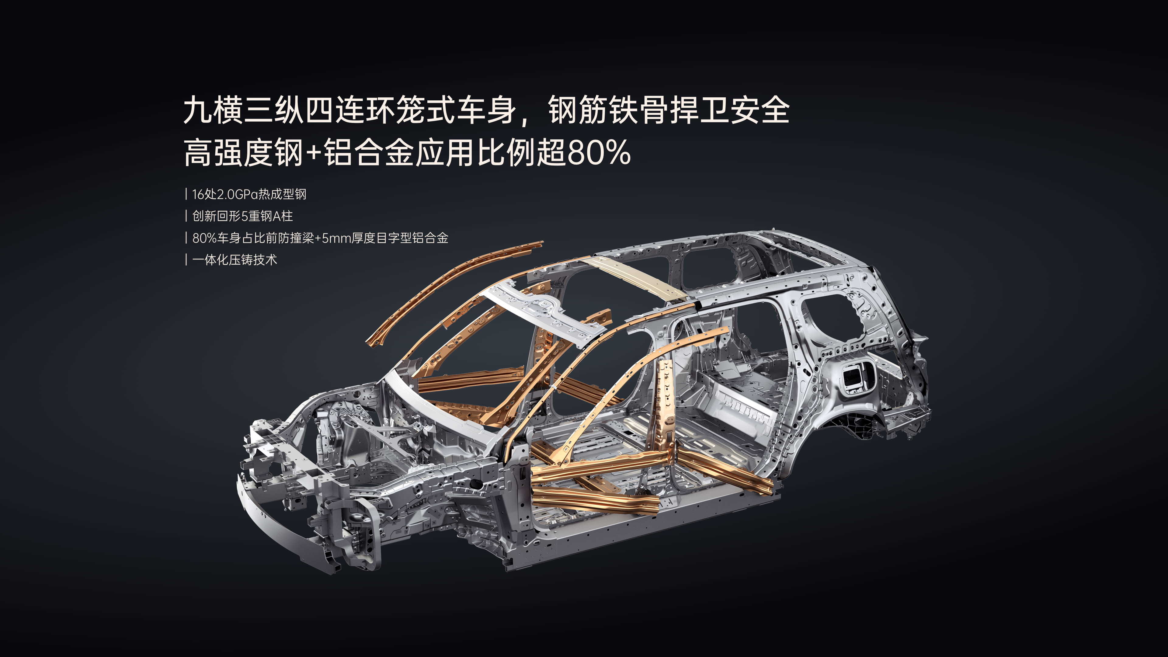 纯电版:全栈1000V三电系统,综合功率540kW、轮端扭矩8770N·m,搭载115kWh电池,CLTC续航720km,并配34合1超级热管理模块。