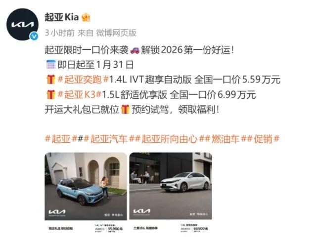 与宝马不同,悦达起亚只是部分车型推出“一口价”政策——起亚K3和2026款起亚奕跑两款车型。其中,2026款起亚奕跑1.4L IVT趣享自动版,全国一口价5.59万元;起亚K3 1.5L舒适优享版,全国一口价6.99万元。
