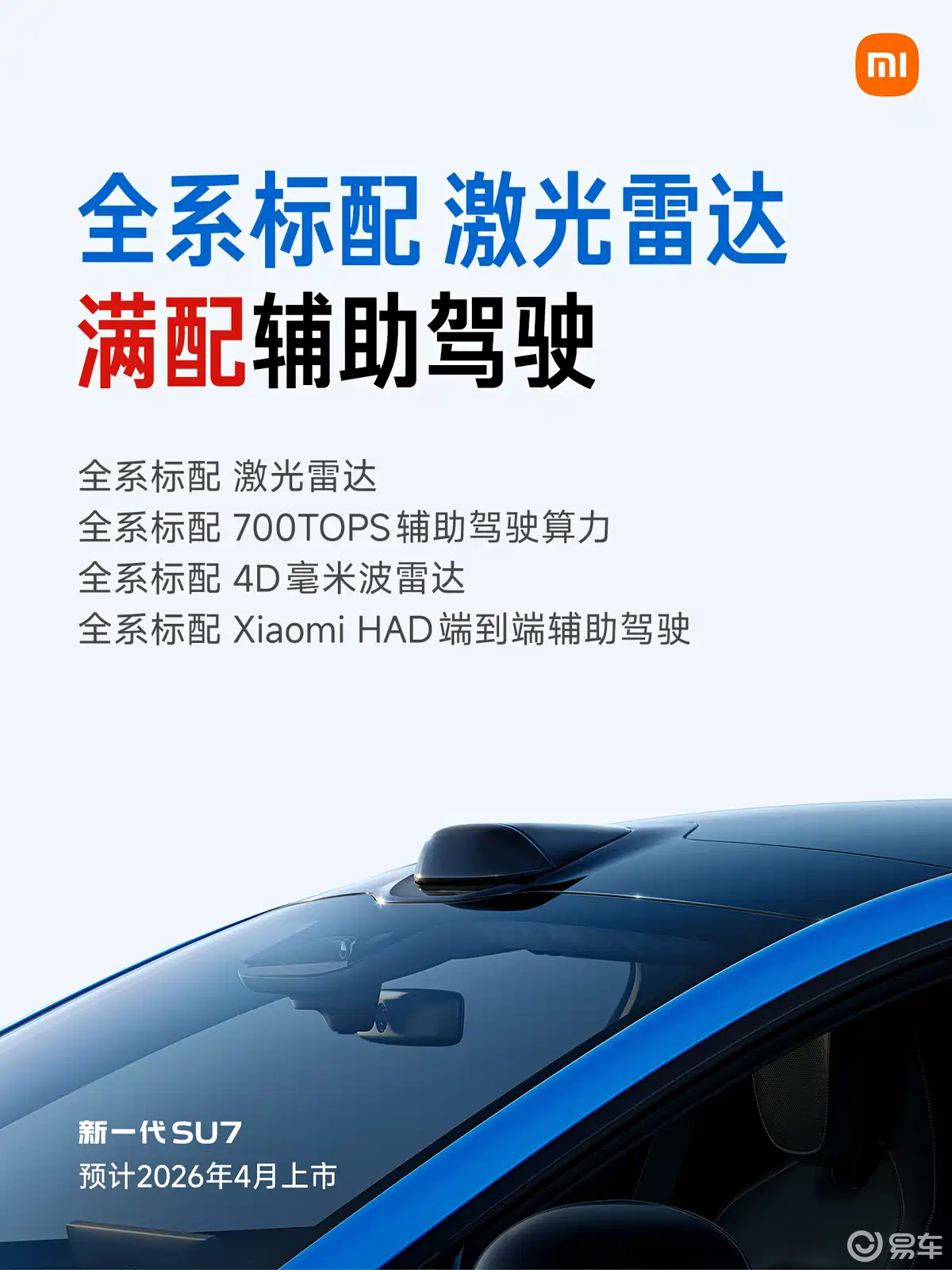 辅助驾驶方面,此前的入门版后驱长续航智驾版是没有激光雷达的,并且智驾算力很低,这次全系标配了激光雷达和辅助驾驶小蓝灯,全系车型的智驾算力都达到了700TOPS,系统方面则都升级成了Xiaomi HAD辅助驾驶系统。