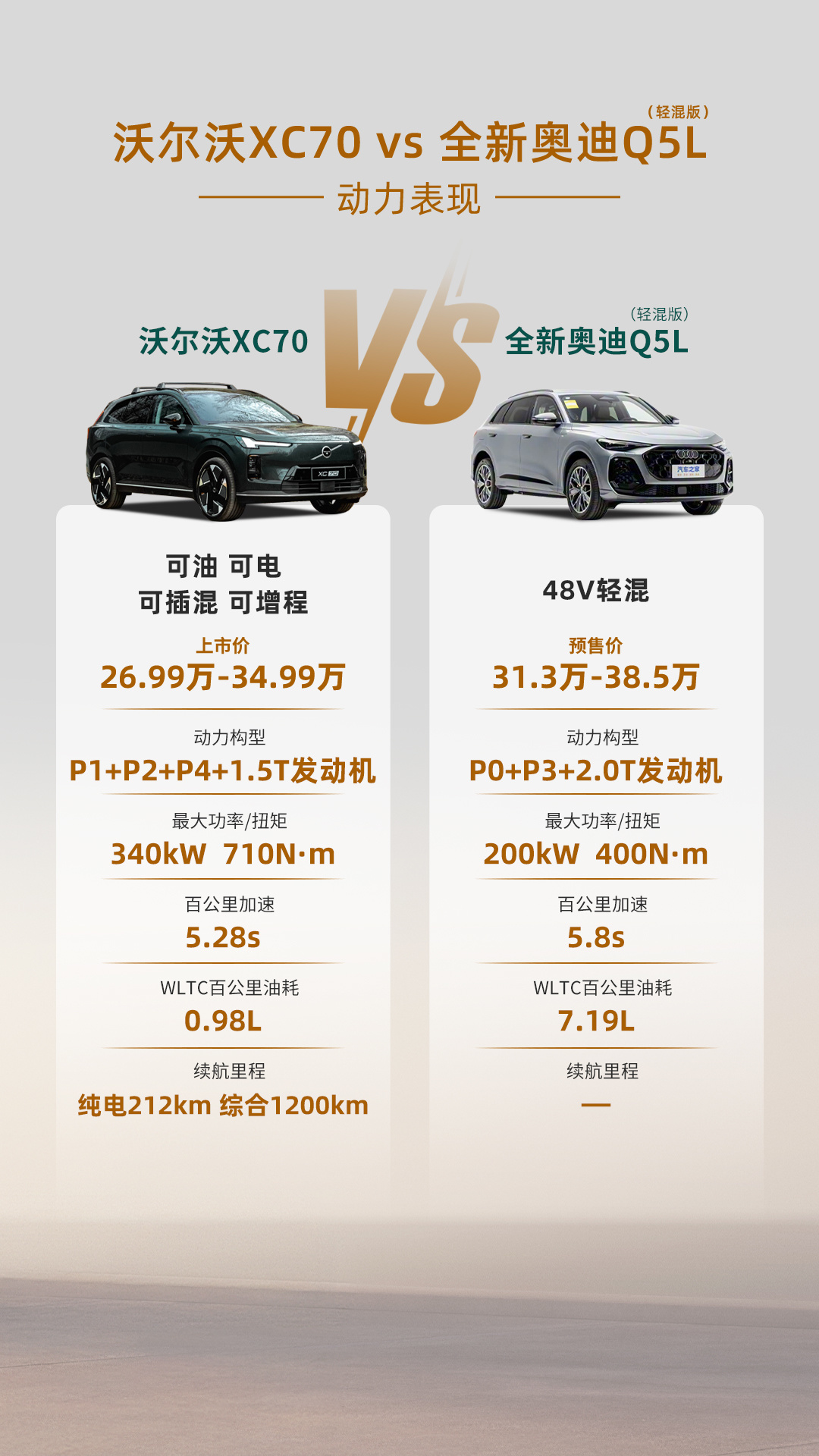 全新奥迪Q5L同样在动力层面进行了升级,整车搭载了第五代EA888 2.0T发动机,在可变截面涡轮技术与48V轻混系统的加持下,整车的动力输出高效且平顺,7DCT变速箱的顿挫感也得到改善。整车还搭载了quattro ultra四驱系统,能在多种路况下提供稳定的抓地力。作为一款纯燃油车,全新奥迪Q5L通过技术升级带来了驾驶体验的优化,然而面对沃尔沃全新XC70这种可油可电且电驱性能的对手时,全新奥迪Q5L在日常使用成本、低速静谧性以及动力系统的综合能效方面,不可避免地面临着一定挑战。