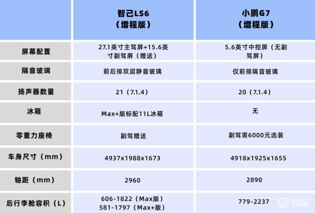 座舱体验上,智己LS6增程版有27.1英寸主驾屏+15.6英寸副驾屏,长途坐车副驾也不无聊,前后排都是双层静音玻璃,加上主动降噪,车内静谧性很好。小鹏G7只有15.6英寸的中控屏,但没有副驾屏,只有前排是隔音玻璃。空间方面,智己LS6轴距2960mm,比G7的2890mm长70mm,后排腿部空间更充裕,不过G7的后行李舱常规容积更大,这一点对家用来说确实实用。