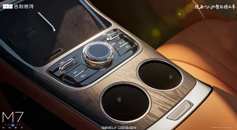 值得一提的是,吉利在中控台中央功能控制区,也用了汉字标注,这也算是一处颇为贴心的细节设定。另外,如图所见,吉利银河M7还给到了一个50W手机无线快充区域,以及哑光金属材质搭配木纹饰板的杯架区域。就第一印象来讲,吉利银河M7的内饰档次感很足,包括金属镀铬、木纹、水晶等材质的运用,能取悦绝大部分家庭用户。