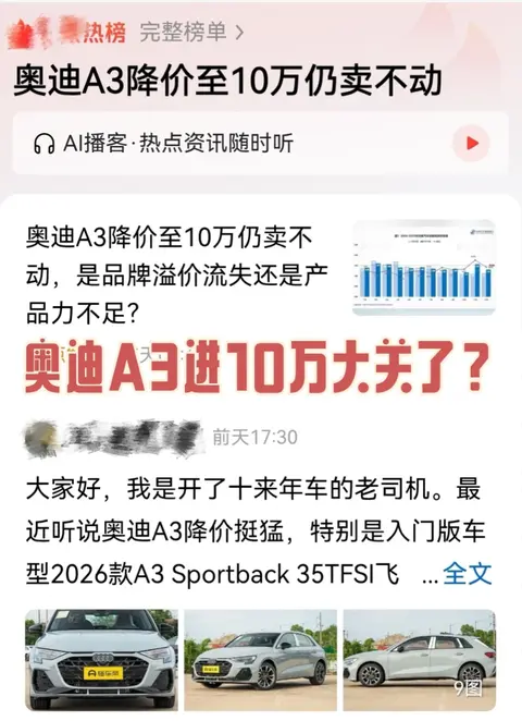 2026款奥迪A3(图片|配置|询价)入门版价格下探至10万区间,本以为能凭借豪华品牌的光环和亲民的价格实现销量逆袭,却不料依旧陷入卖不动的窘境。这一现象不仅登上车市热榜,更引发了大众对于“品牌溢价是否失效”“豪华入门款还有没有市场”的热议。而从网友的真实反馈和市场现状来看,奥迪A3的遇冷并非偶然,而是产品力、市场竞争、服务体验等多重因素叠加的结果,更是当下汽车消费理性化的直接体现。