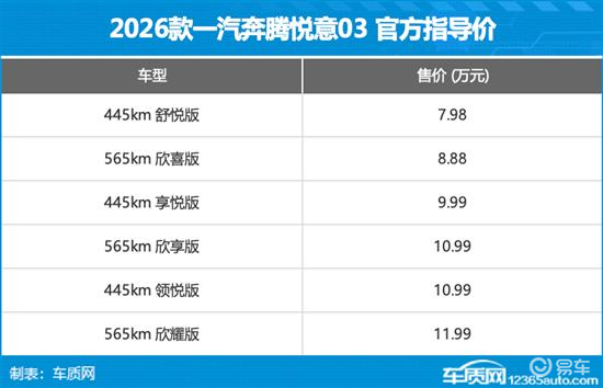 3月8日,车质网从官方渠道获悉,2026款一汽奔腾悦意03正式上市。新车为改款车型,主要针对外观细节和配置进行调整,动力依旧搭载单电机,CLTC纯电续航里程为445km和565km。此次上市新车共推出6款车型,售价区间为7.98-11.99万元。