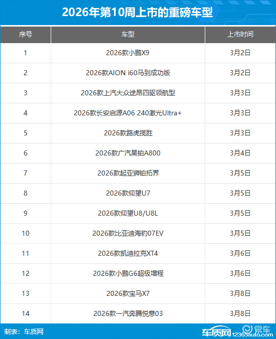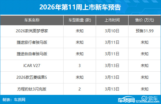 2026年第11周(3月9日-3月15日)上市新车预告