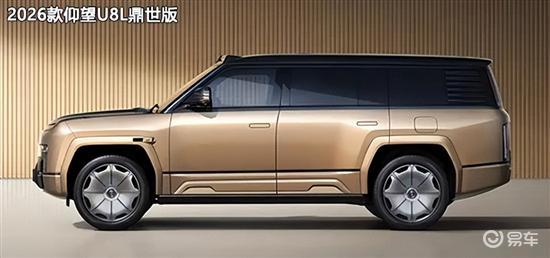 2026款仰望U8L鼎世版采用黑/金双色搭配方案,并且还引入了24K真金打造的车标,有效提升尊贵感。外观细节方面弱化越野风格,尾部取消外挂式备胎,标配上下对开式电动尾门。尺寸方面,长宽高分别为5400mm*2049mm*1921mm,轴距3250mm。