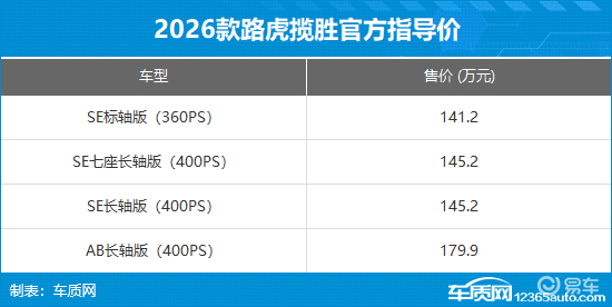 3月3日,车质网从路虎官方获悉,2026款路虎揽胜正式上市,此次共推出4款车型,官方指导价141.2-179.9万元。新车主要是针对售价和款型有所调整,并且配置进一步升级。