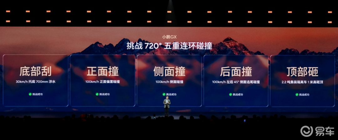 这些配置侧重主动安全防护,当撞击无法避免时,车身的抗冲击能力就是最后一道防线。这种城堡式的安全设计是否可靠,还需真实碰撞测试验证,为此小鹏GX经历了严苛的五重安全测试。首先是700mm涉水测试,车辆从容驶入涉水区域,在水没过前备箱盖的情况下依旧平稳前行。随后进行底部刮擦测试,车辆以30km/h时速通过凸起物,让凸起物精准划过车底,检测车底抗压能力,尤其是电池包是否坚固、有无变形或起火损毁风险。测试通过后,车辆迎来100km/h正面偏置碰撞,模拟高速行驶突发碰撞场景,GX顺利通过测试,安全气囊及时弹出,紧急救援系统也自动快速接入。带着碰撞痕迹,车辆紧接着接受100km/h侧面碰撞测试,侧气帘快速弹出,A/B/C/D柱无变形,最关键的是隐藏式门把手可正常开启,无丝毫卡顿或锁死情况。之后是100km/h车尾左后45°追尾碰撞,后备箱无明显坍塌,紧邻后备箱的D柱也无形变。历经多轮测试的GX,还要迎接最后一项考验:从车顶1米高处砸下2.2吨重的集装箱,预想中的车身压塌场景并未出现,仅车顶有轻微损伤,支撑车身的A/B/C/D柱毫无变形。