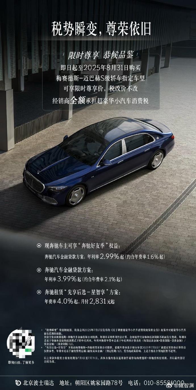 7月21日,有网友通过微博晒出海报并发文称,“迈巴赫S级轿车和GLS SUV的(豪车税)政策也来了,8月31日前奔驰(经销商承担)豪车税。”