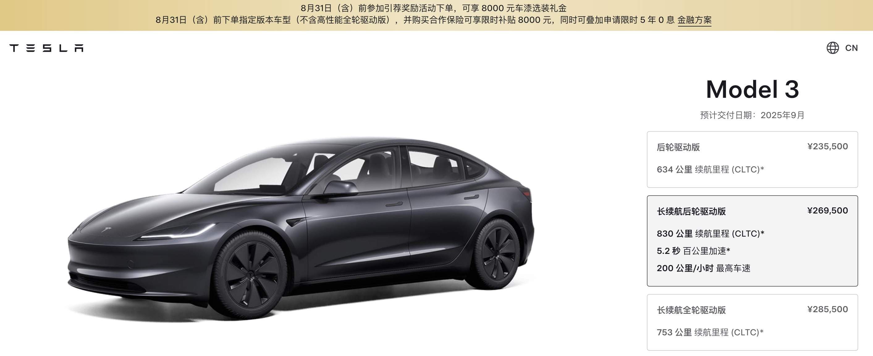 8月12日,特斯拉官方宣布,Model 3长续航后轮驱动版正式上线,续航830公里(CLTC),售价26.95万元起,现在下定预计9月交付。购车权益方面,在8月31日前下单可享5年0息贷款、8000元保险补贴、8000元车漆选装礼金、特享充电权益及智能辅助驾驶免费转移服务等优惠。