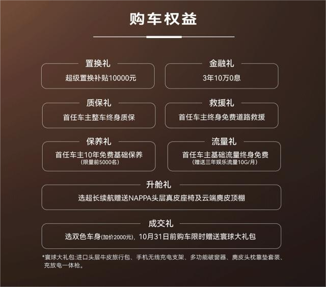 官方推出的价值65000元权益政策可谓全面覆盖购车用车全周期:10000元超级置换补贴、价值10000元的3年10万元0息贷款、价值10000元的首任车主10年免费基础保养。