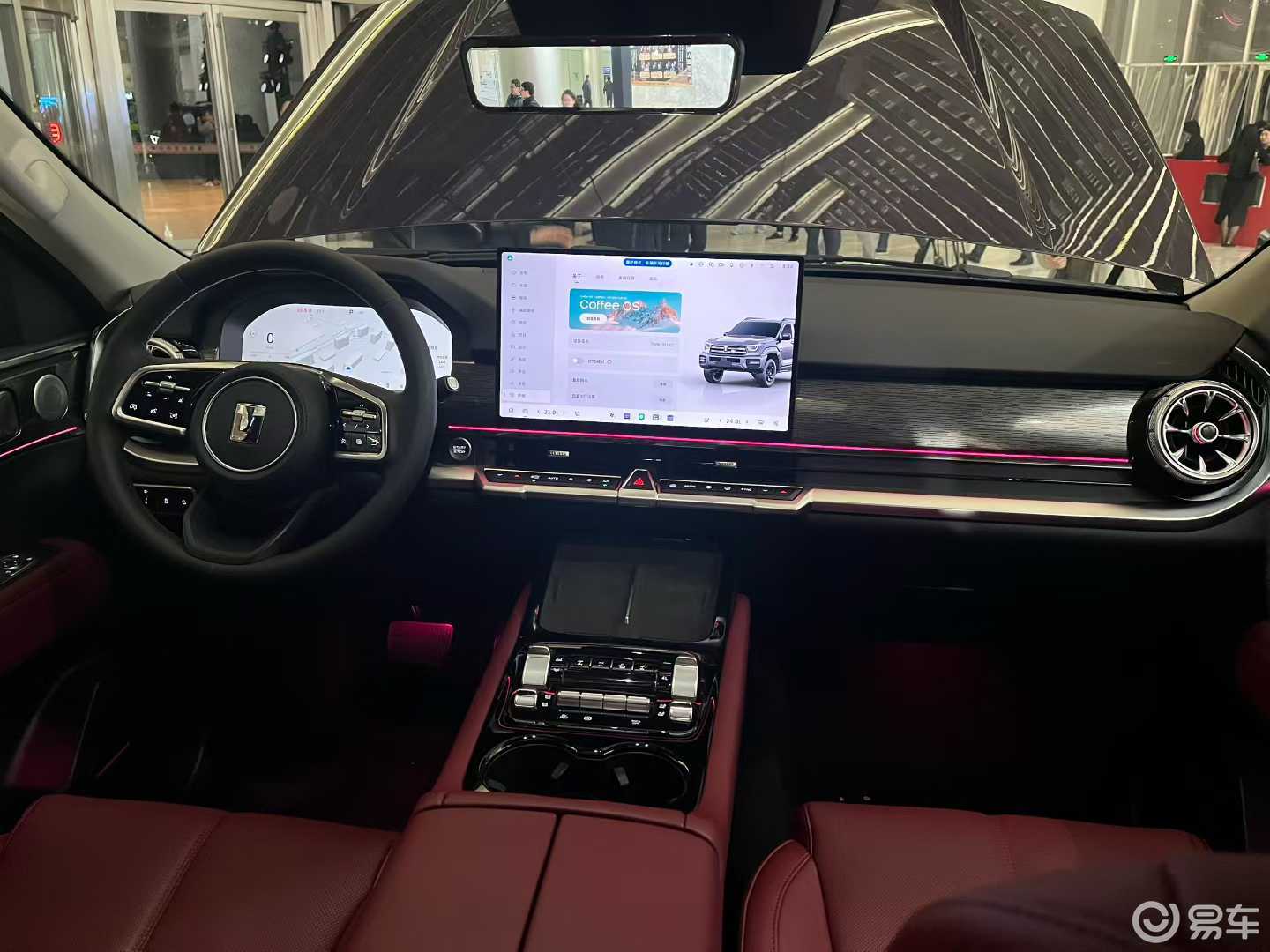 内饰升级亮点颇多,新车换装全新大尺寸的悬浮屏,改用怀挡设计,中控台下方增加了两个带有通风的无线充电面板,以及更具金属质感的越野控制按键。前排中央扶手内集成冷暖箱,提升了实用性能。另外还取消了全景天窗同时增加了吸顶折叠屏,后排空调出风口屏幕也进行了重新优化。车机系统搭载最新的Coffee 3车机系统。智驾辅助层面,搭载第三代Coffee Pilot Ultra辅助驾驶系统,支持城市NOA(Navigate on Autopilot,城市导航辅助驾驶)和高速NOA等功能。